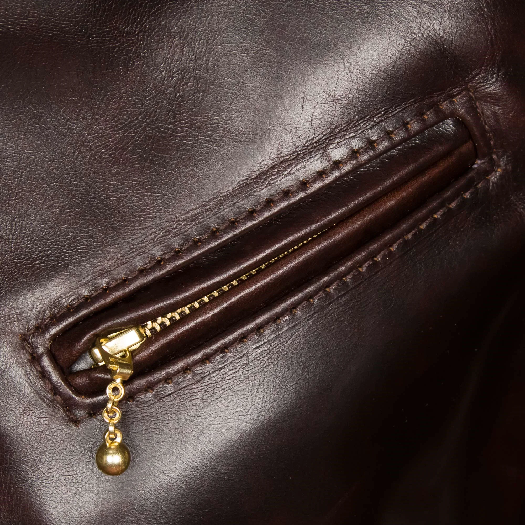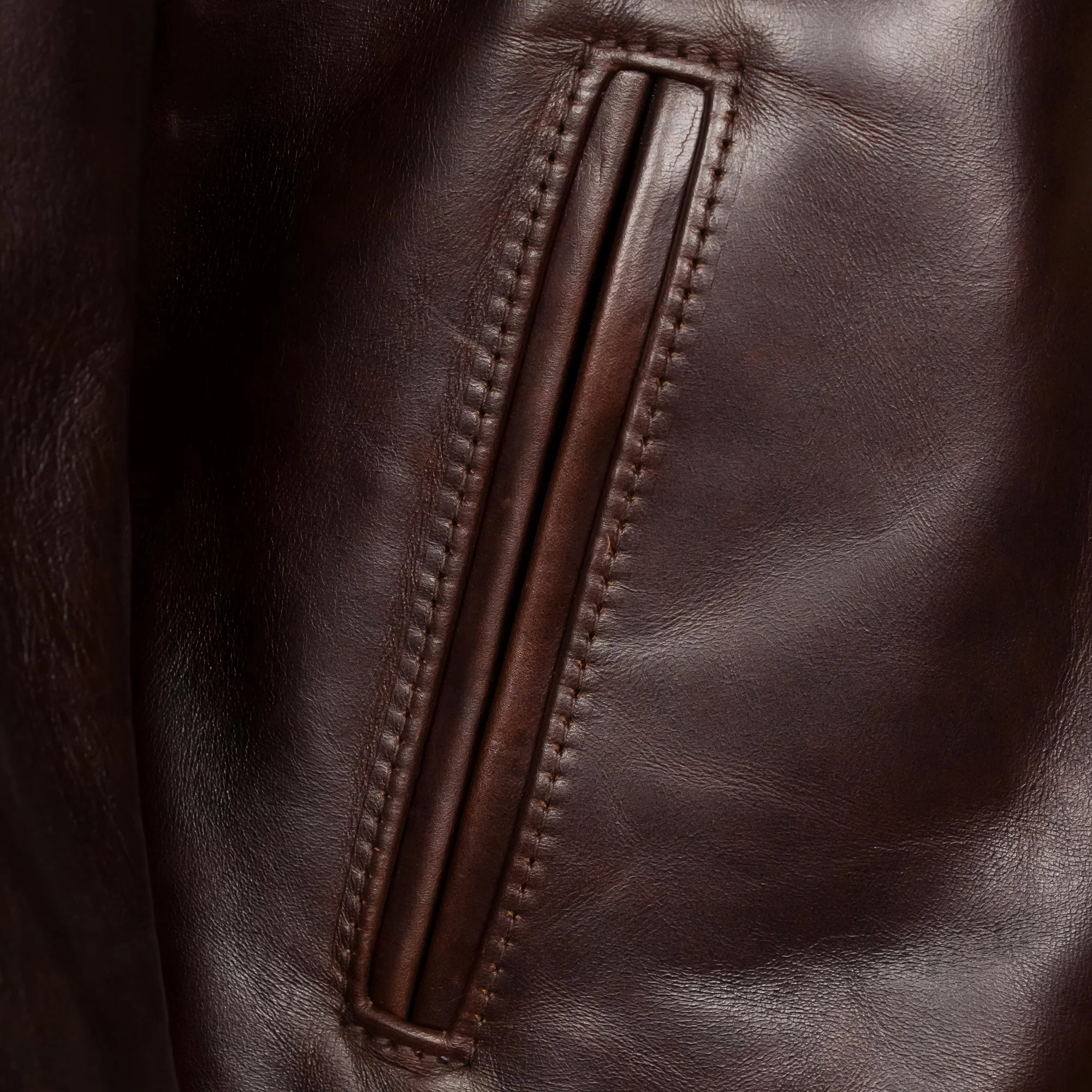 The shiny dark brown leather really stands out. It looks classy and feels thick and durable. Easily my favorite jacket this season.