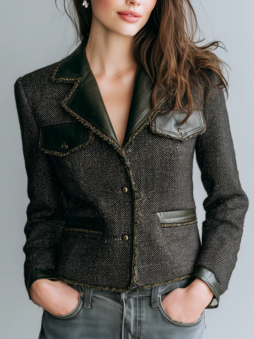 The coat features a front metallic button closure, stylish leather-detailed panels, and a short-body curve-tailored silhouette that enhances your natural form. Its folding leather coat collar, contrast leather cuffs, and full piping elevate the overall look, making it a perfect balance of class and sophistication.