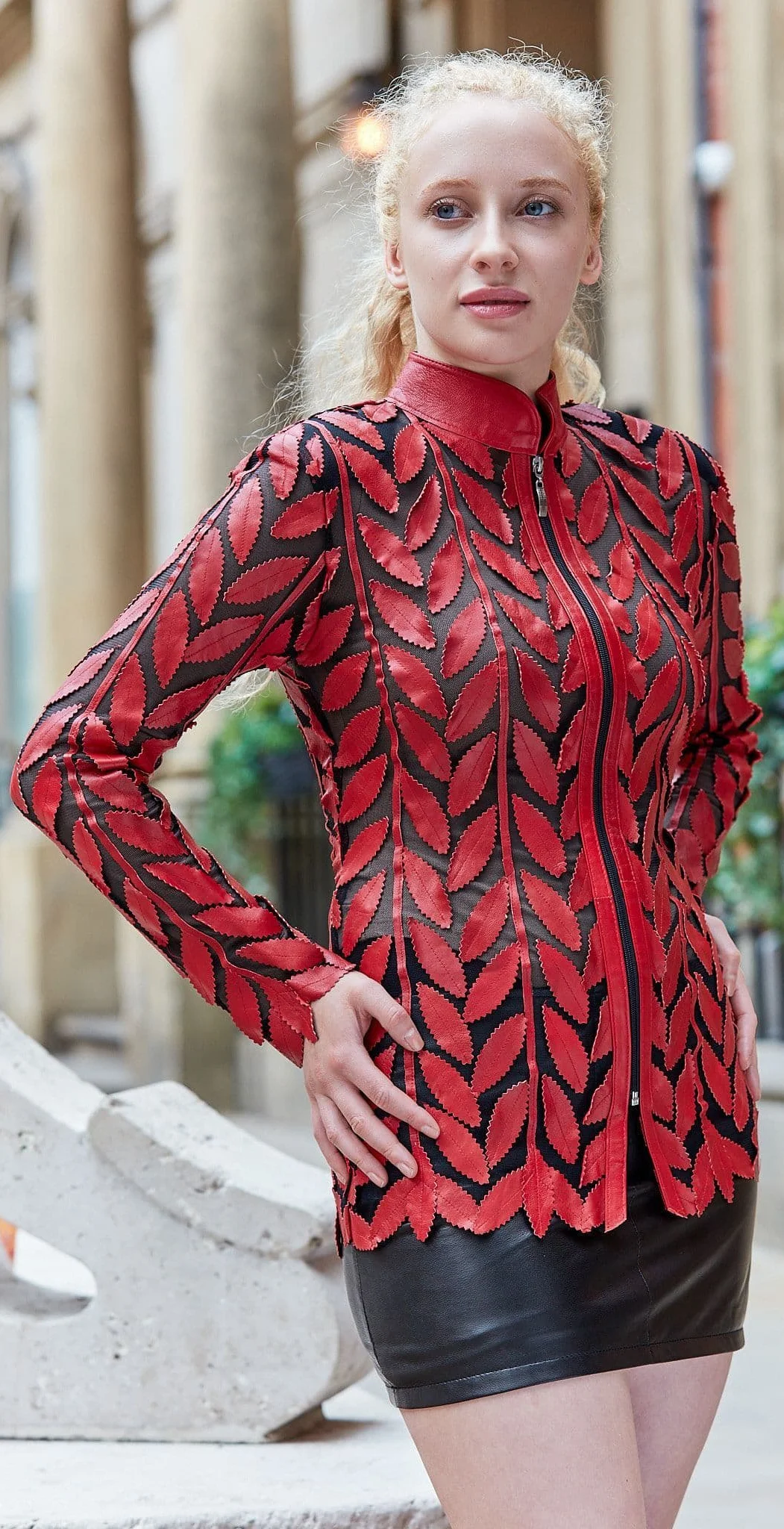 Its standout feature is the unique fusion of artificial Real Red Leather leaves with premium sheep skin leather, giving the jacket a bold, fashion-forward appearance. The body-contoured stitching enhances the feminine silhouette, while the straight collar and slim-fit sleeves add a sleek, modern edge.