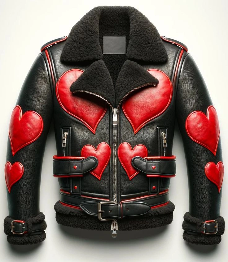 I love how the red heart accents pop beautifully against the dark leather. It’s romantic, bold, and perfect for special occasions.